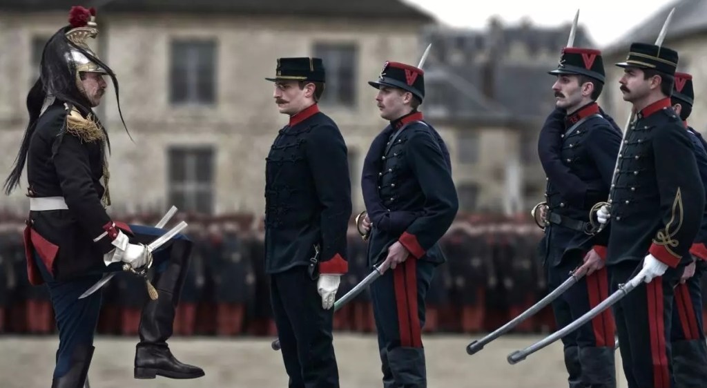 J’accuse comienza con la destitución de Dreyfus (Louis Garrel). Esta escena es toda una puesta en escena armada por el ejército, con el Louvre y con la tour Eiffel como escenografía. Los movimientos, los tiempos, la actuación: todo sigue un registro. Es decir que no sólo se destituye a un general sino que se pone en escena esta destitución: hay una forma.
